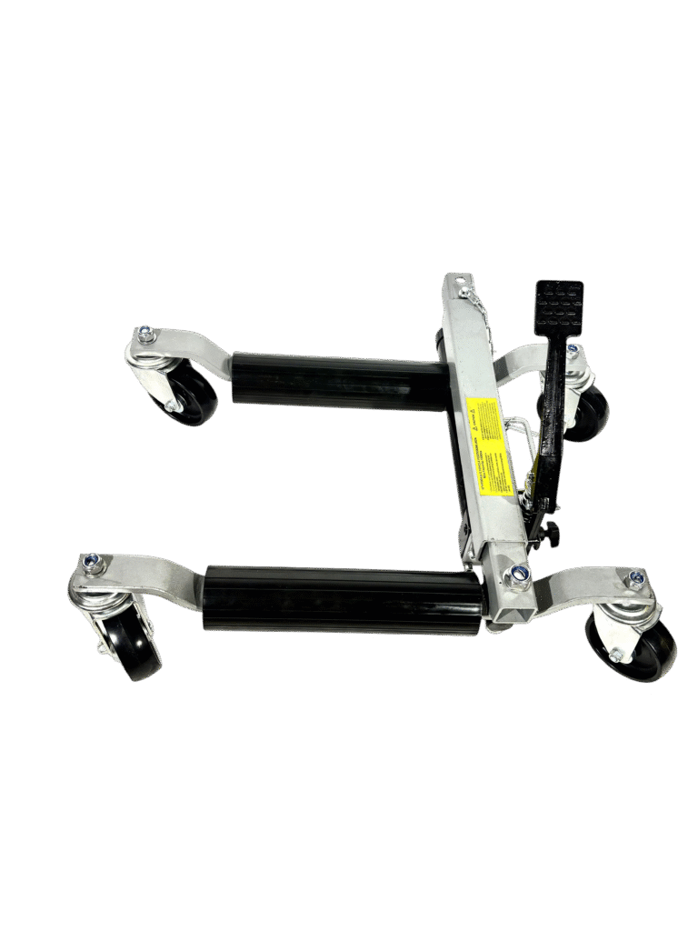 A vehicle positioning jack is a hydraulic device that lifts the car by the tires and allows sideways or 360° movement. With swivel casters and a strong frame, it helps technicians reposition vehicles quickly and safely.
